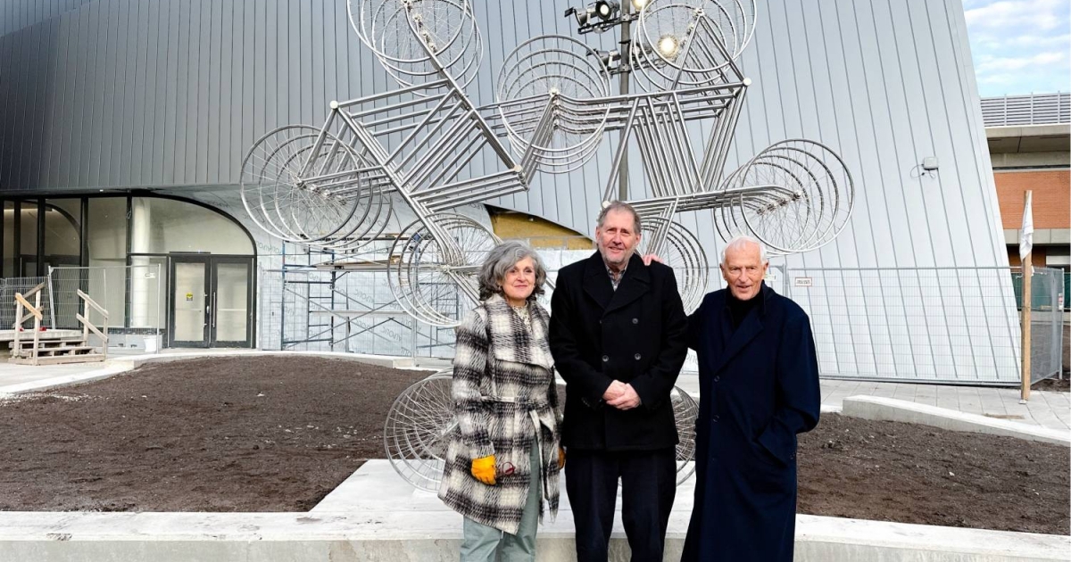 The 12-foot by 6-foot metal sculpture is made up of 18 bicycles and sits at the entrance of the Desautels Concert Hall, which is scheduled to open in September 2024.