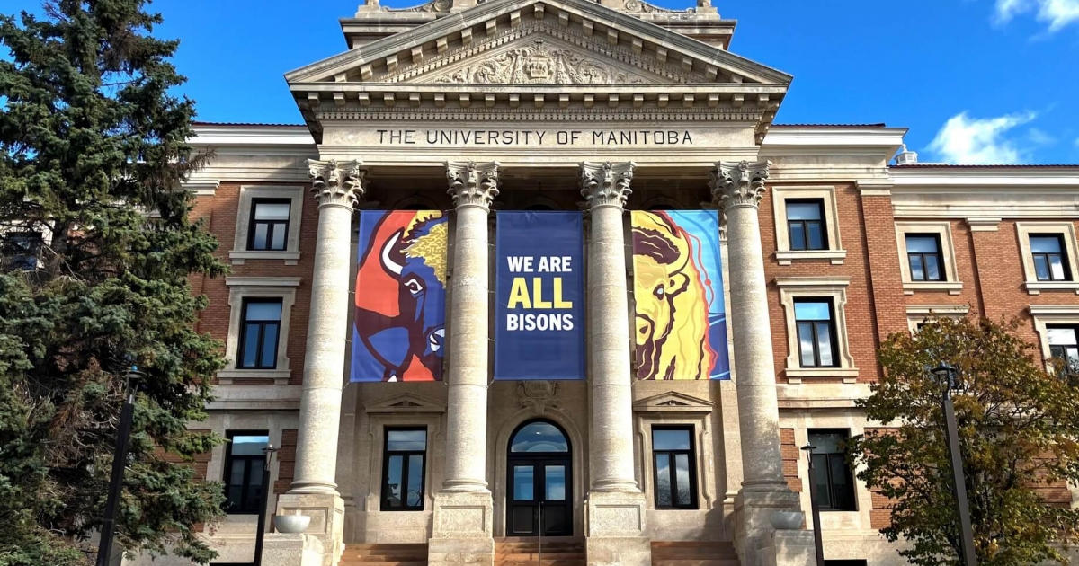 Two Bisons are displayed on the banners: one a vibrant red and blue design from our original group of Bison illustrations; the second displays the “Nîpîy Iskôtêw – Water Fire,” illustration by Ininew (Swampy Cree) and Anishinabe (Ojibwe) artist Peatr Thomas, the first of four new Bison designs by Indigenous artists that will be introduced throughout the year. A third banner states “We are all Bisons” highlighting that—no matter our unique path—we are each a part of the UM community.